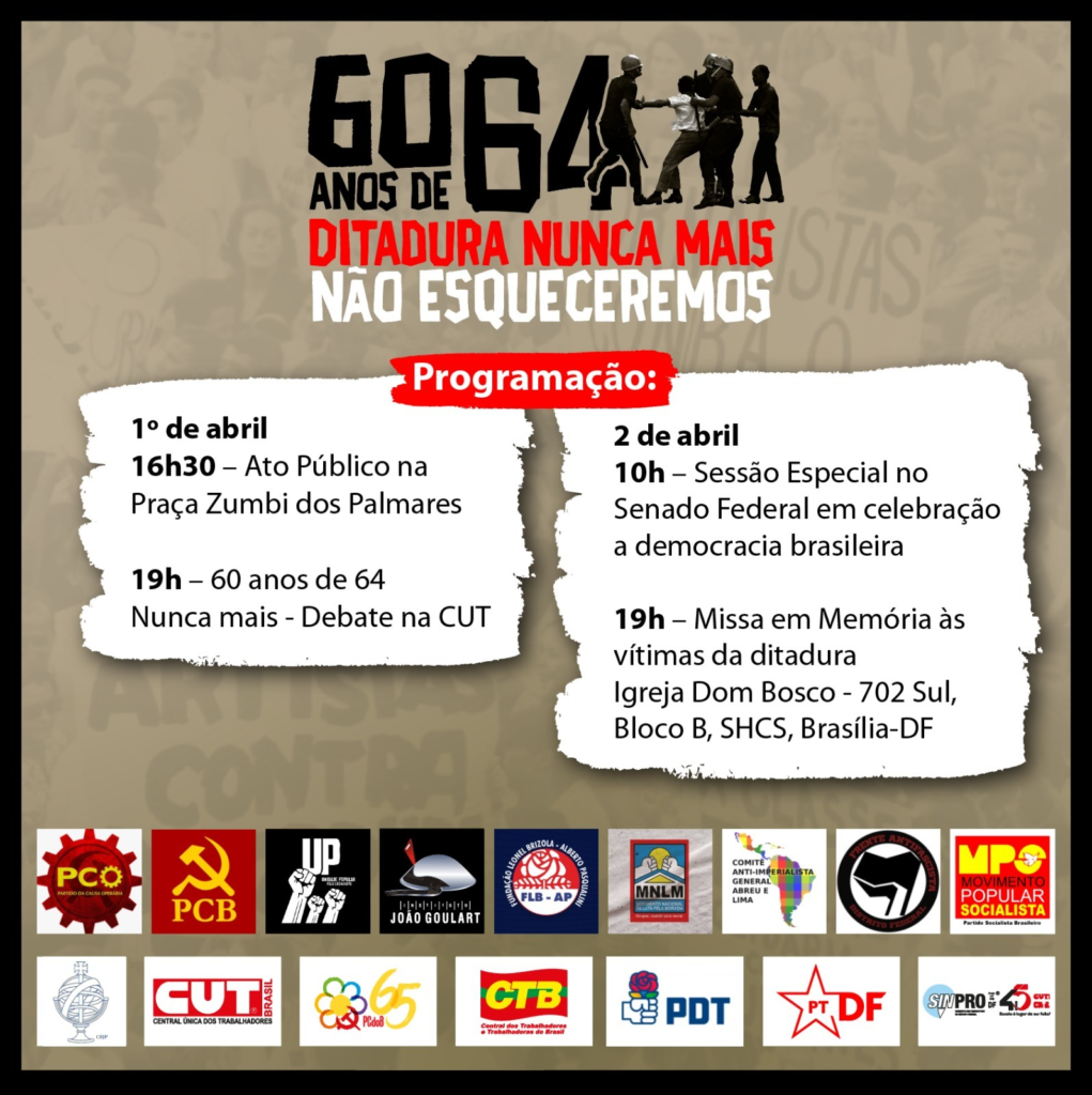 Nesta segunda-feira (1º/4), completam-se 60 anos do golpe de Estado que lançou o Brasil em mais de duas décadas de obscurantismo. Para relembrar o período, que foi marcado pelo total desrespeito aos direitos e às garantias fundamentais, a CUT-DF e diversas organizações da sociedade civil realizam atividades na próxima semana.