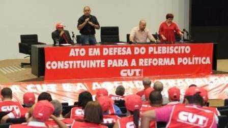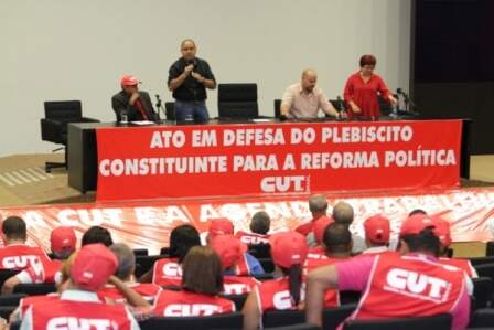 Militantes CUTistas, pastorais sociais, partidos, organizações e ativistas pela modificação do sistema político do Brasil se reuniram nessa quarta-feira (4) no auditório Nereu Ramos, da Câmara dos Deputados, e realizaram ato em apoio ao Decreto Legislativo 1508/14. O instrumento propõe a realização de plebiscito oficial com a mesma pergunta do plebiscito popular, realizado em 2014: Você é a favor de uma Assembleia Nacional Constituinte Exclusiva e Soberana sobre o Sistema Político?