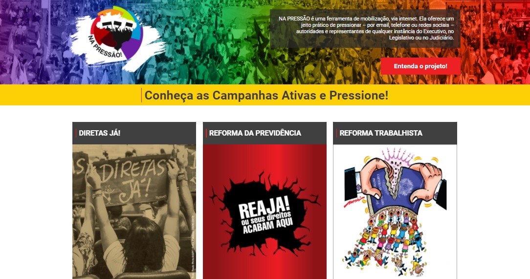 O ‘Na Pressão’ é um banco de dados que permite acessar os contatos de autoridades que irão decidir sobre projetos e leis. Já estão cadastrados os contatos de parlamentares e ministros envolvidos com as Reformas Trabalhista e Previdenciária, além de ministros do STF, que tratarão da proposta de eleições diretas em caso de saída do ilegítimo Michel Temer (PMDB).