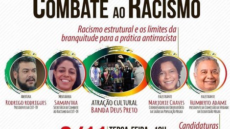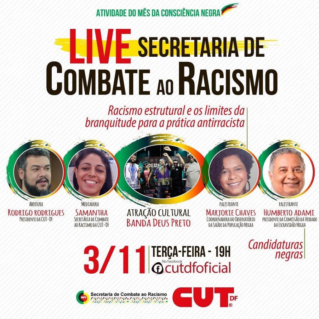 Dando início às atividades do mês da Consciência Negra, a Secretaria Estadual de Combate ao Racismo da CUT-DF realizará na próxima terça-feira (3), às 19h, uma live com o tema Racismo Estrutural e os Limites da Branquitude para a Prática Antirracista e Candidaturas Negras.