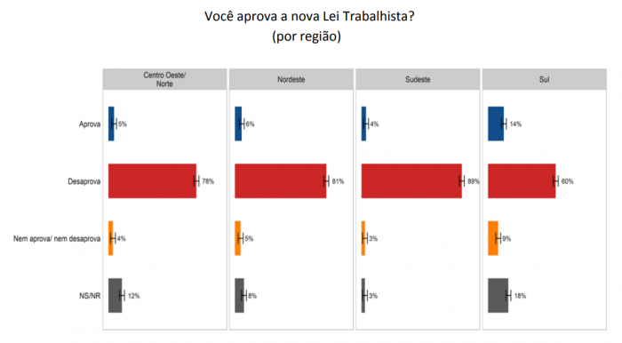 Os percentuais mais negativos ficaram com o Sudeste (76%); Centro-Oeste/Norte, com 68%; e, Nordeste, com 65%, onde a maioria dos entrevistados acredita que as mudanças na CLT são boas somente para os patrões. No Sul, 44% respondeu que os patrões são os mais beneficiados com as mudanças.