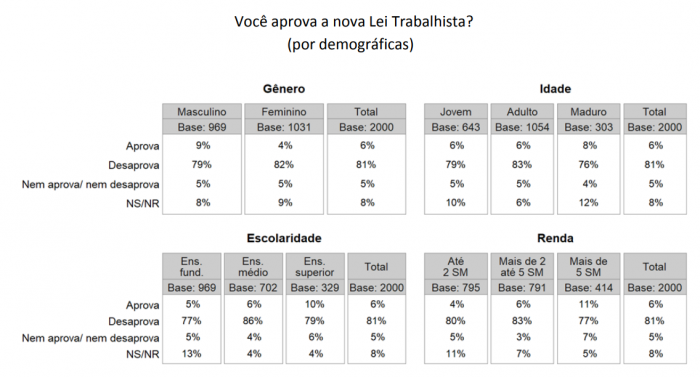 Os altos percentuais de desaprovação à “nova CLT”, assim chamada por parte da mídia conservadora, foram registrados em todos os gêneros, idades e classes sociais.