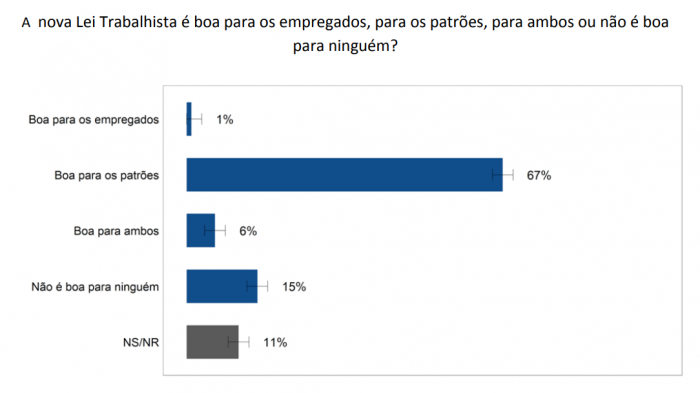 Para 67% dos entrevistados, a nova Lei Trabalhista só é boa para os patrões. Para 1%, é boa para os trabalhadores. Outros 6% disseram que é boa para ambos; 15% não tiveram dúvidas em dizer que não é boa para ninguém; e 11% não souberam ou não quiseram responder.