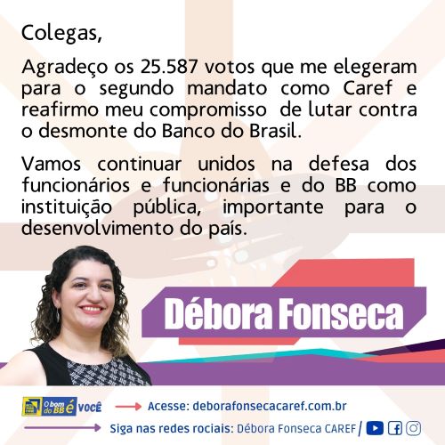 Candidata apoiada pelo Sindicato dos Bancários de Brasília e pela Contraf-CUT, Débora Fonseca venceu o segundo turno da eleição para representante dos funcionários no Conselho de Administração do Banco do Brasil (Caref) com 25.587 votos, número correspondente a 76% dos votos válidos. Seu concorrente, Aristides Milton Café, obteve 7.986 votos.