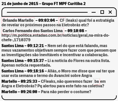 Um exemplo ilustrativo desse método ocorreu relativamente cedo nas operações. Em 21 de junho de 2015, o procurador da Lava Jato Orlando Martello enviou a seguinte pergunta ao colega Carlos Fernando Santos Lima, no grupo FT MPF Curitiba 2, que reúne membros da força-tarefa: “qual foi a estratégia de revelar os próximos passos na Eletrobrás etc?”. Santos Lima disse não saber do que Martello estava falando, mas, com escancarada franqueza, afirmou: “meus vazamentos objetivam sempre fazer com que pensem que as investigações são inevitáveis e incentivar a colaboração.”