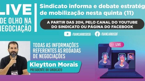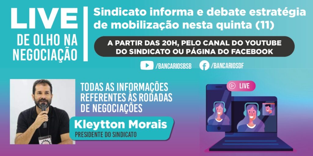 ‘De olho na negociação’ é o tema da live que o Sindicato realiza nesta quinta-feira (11), às 20h, para debater estratégias de mobilização da Campanha Nacional dos Bancários 2022. Sob o comando do presidente da entidade, Kleytton Morais, o programa vai dar todas as informações referentes às rodadas de negociações, iniciadas no dia 22 de junho.