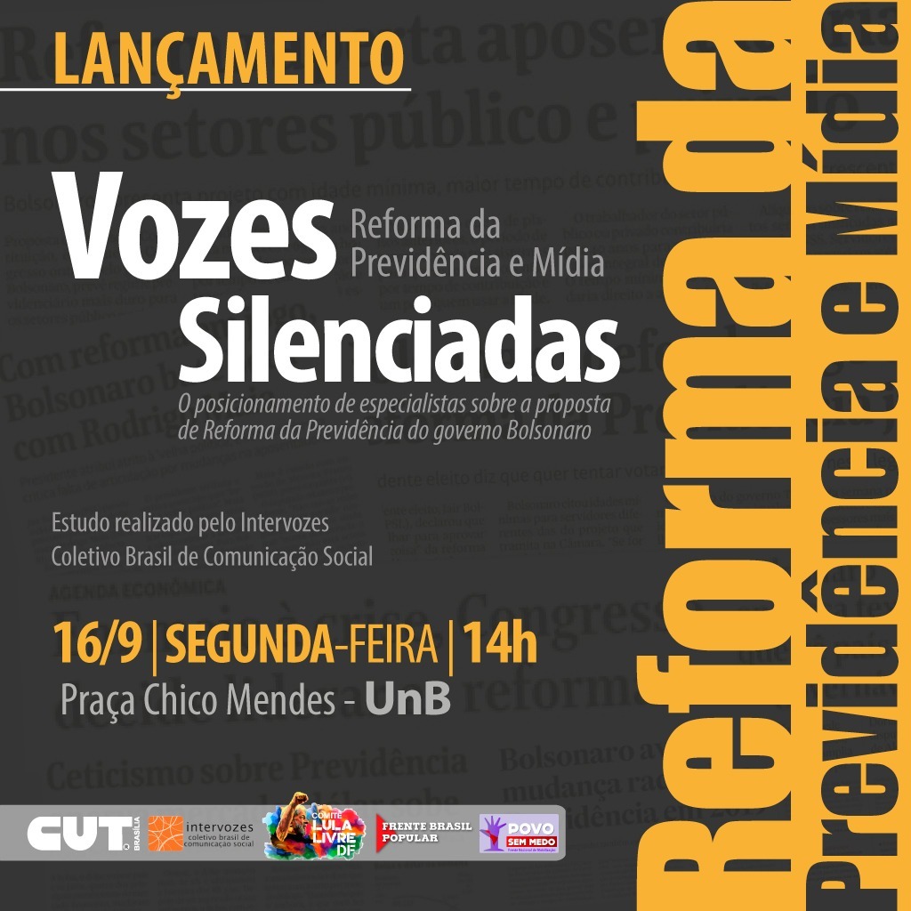 CUT Brasília, Frente Brasil Popular, Frente Povo Sem Medo e Comitê Lula Livre DF realizarão no próximo dia 16, segunda-feira, atividade de lançamento do estudo Vozes Silenciadas – Reforma da Previdência e Mídia: o posicionamento de especialistas sobre a proposta do governo Bolsonaro. A atividade será às 14h, na Praça Chico Mendes da UnB.