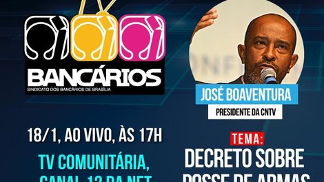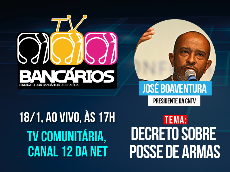 O TV Bancários na TV Comunitária desta sexta-feira (18) coloca em pauta o decreto que flexibiliza a posse de armas de fogo no Brasil em entrevista com o presidente da Confederação Nacional dos Vigilantes (CNTV), José Boaventura. O programa será transmitido a partir das 17h pelas redes sociais do Sindicato e pelo canal 12 da Net.