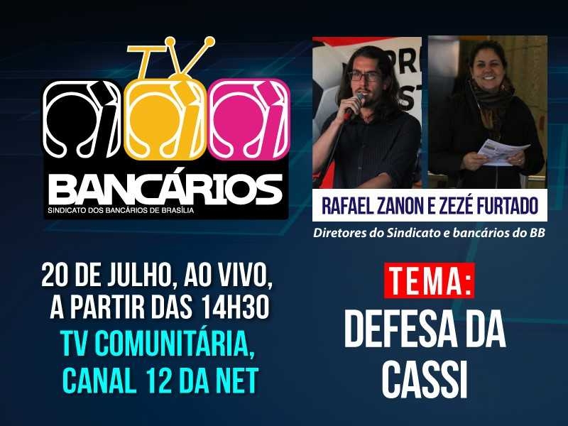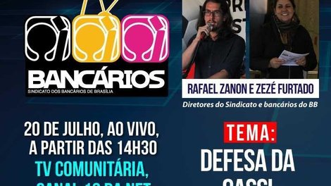 O TV Bancários desta sexta-feira (20) coloca em discussão os ataques da direção do Banco do Brasil aos direitos conquistados por bancárias e bancários para a Cassi. Como convidados, o programa recebe os diretores do Sindicato e bancários do BB Rafael Zanon e Zezé Furtado. A edição inédita será transmitida ao vivo, a partir das 14h30, pela TV Comunitária (Canal 12 da Net) e pelas redes sociais do Sindicato.