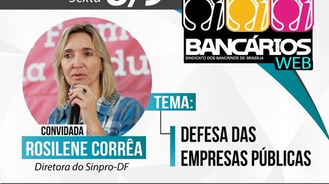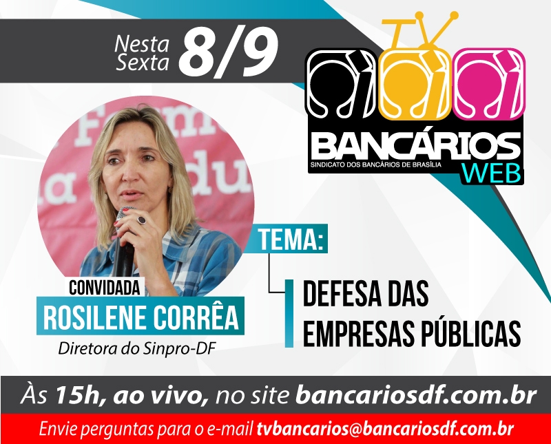 O TV Bancários Web desta sexta (8) apresentou a importância da manutenção e fortalecimento das empresas públicas do Distrito Federal. Como convidada, o programa recebeu a diretora do Sindicato dos Professores do DF (Sinpro-DF), Rosilene Corrêa.