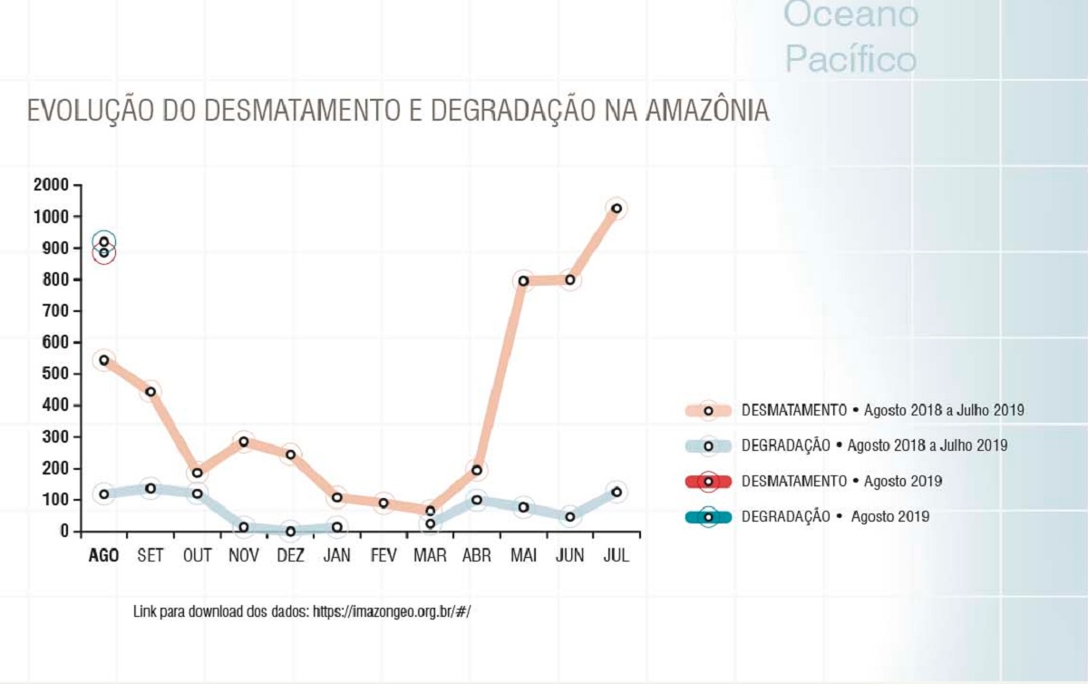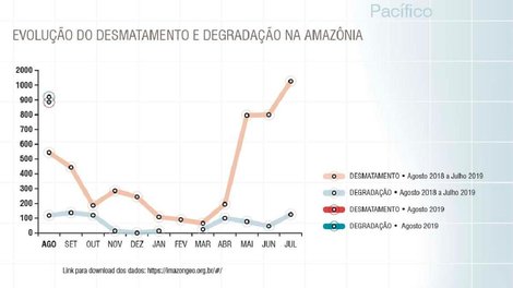 Os índices de desmatamento na Amazônia seguem em alta. Em agosto desse ano, foram detectados 886 quilômetros quadrados de desmatamento na Amazônia Legal, de acordo com o Sistema de Alerta de Desmatamento (SAD). Em comparação com o mesmo mês no ano anterior, esse número representa aumento de 63%. Em 2018, foram registrados 545 quilômetros quadrados de devastação. O aumento tem sido constante, com ampliação significativa resultado das políticas do governo de Jair Bolsonaro (PSL).