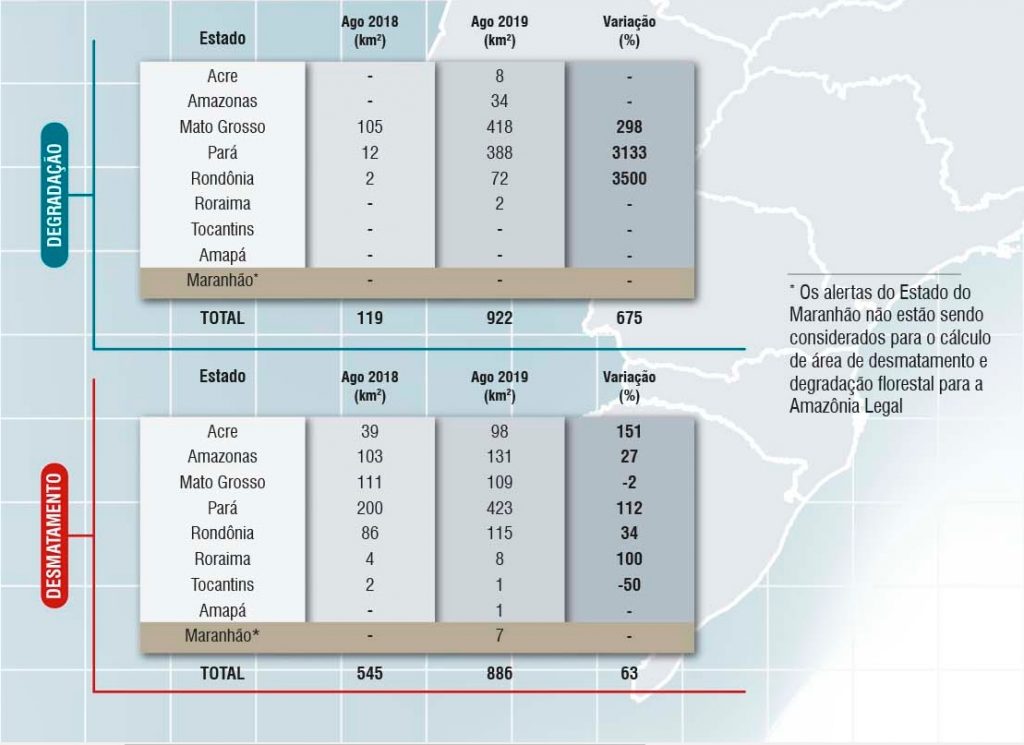 Os dados são ainda mais alarmantes quando as queimadas e extrações seletivas de madeira são levadas em conta, em um índice chamado de “degradação”. Nesse cenário, foram computados 922 quilômetros quadrados, aumento de 675% em comparação com agosto do ano anterior, que registrou 19 quilômetros quadrados. Destaque negativo para o estado do Mato Grosso, que contabiliza 45% do total, e do Pará, com 42%.