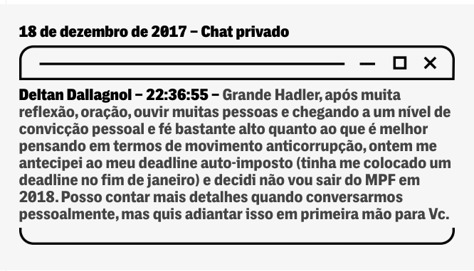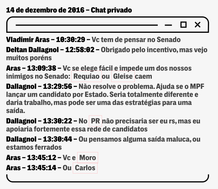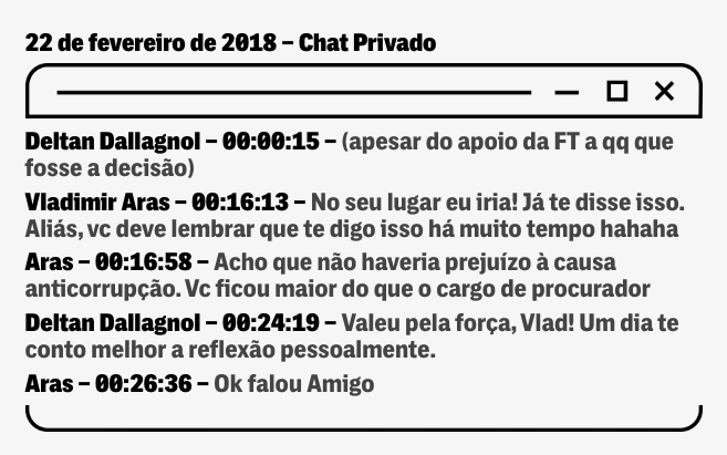 A PRIMEIRA MENÇÃO à aventura política de Deltan Dallagnol no Telegram surgiu em meados de dezembro de 2016, numa conversa entre ele e o procurador Vladimir Aras, que trabalhava em Brasília. Aras é próximo de Dallagnol, e foi apoiado por ele como sucessor de Raquel Dodge na PGR.