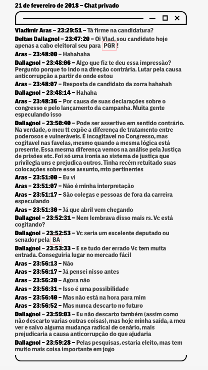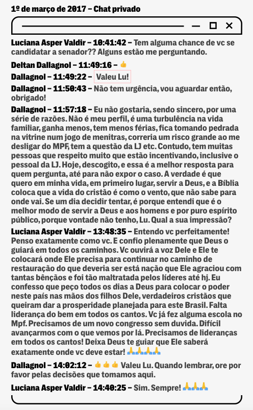 Pedimos, novamente, uma entrevista a Dallagnol para que o procurador falasse sobre suas ambições políticas. Ele voltou a se recusar e preferiu responder via assessoria: “O procurador Deltan Dallagnol se lembra de ter feito reflexões sobre esse assunto, mas não vai comentar pensamentos ou cogitações de caráter íntimo. As mensagens são oriundas de crime cibernético e têm sido usadas fora do contexto para acusações falsas”.