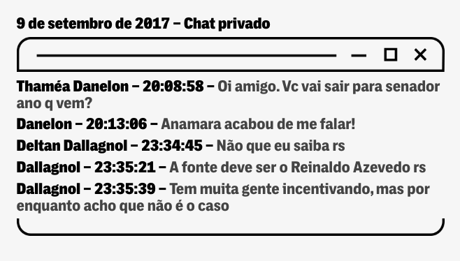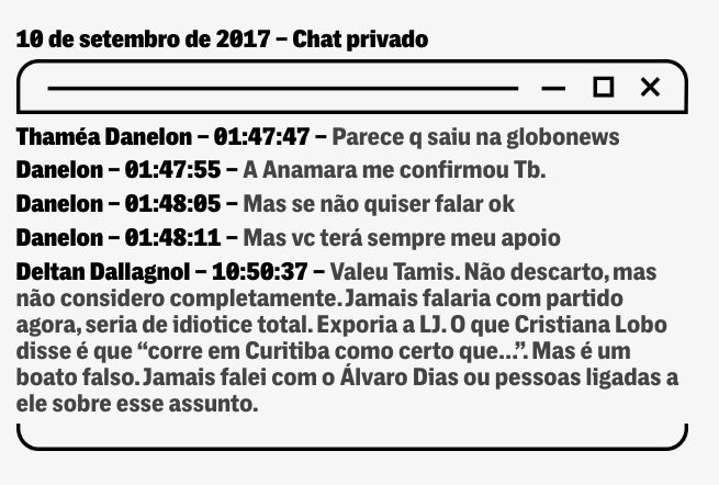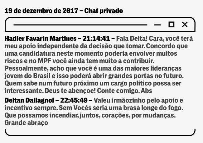 EM JULHO DAQUELE ANO, o boato chegou à procuradora Anamara Osório, que enviou via Telegram a seguinte mensagem a Dallagnol: “Delta!!!! Você senador para já!! Vamos falar disso?! O que vc precisa? Hehe”. O chefe da Lava Jato não respondeu.