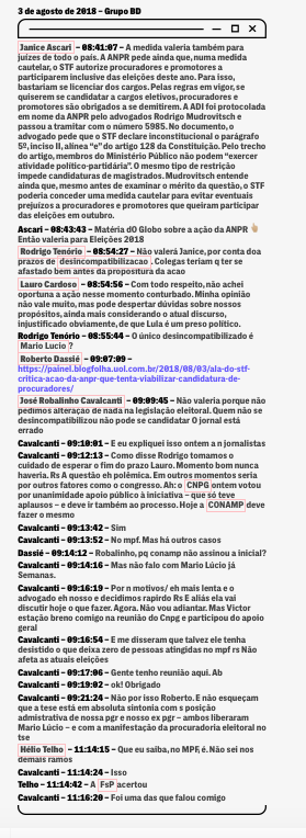 Ainda assim, a ação foi bastante discutida num dos grupos que os procuradores mantinham no Telegram, chamado BD. Sem conhecer os planos de Dallagnol e da Lava Jato para uma eventual candidatura do chefe da força-tarefa ao Senado, alguns se preocupavam que a ação pudesse causar desgaste à categoria e justificar o discurso de que o ex-presidente Lula é um preso político, ecoado por aliados do petista.