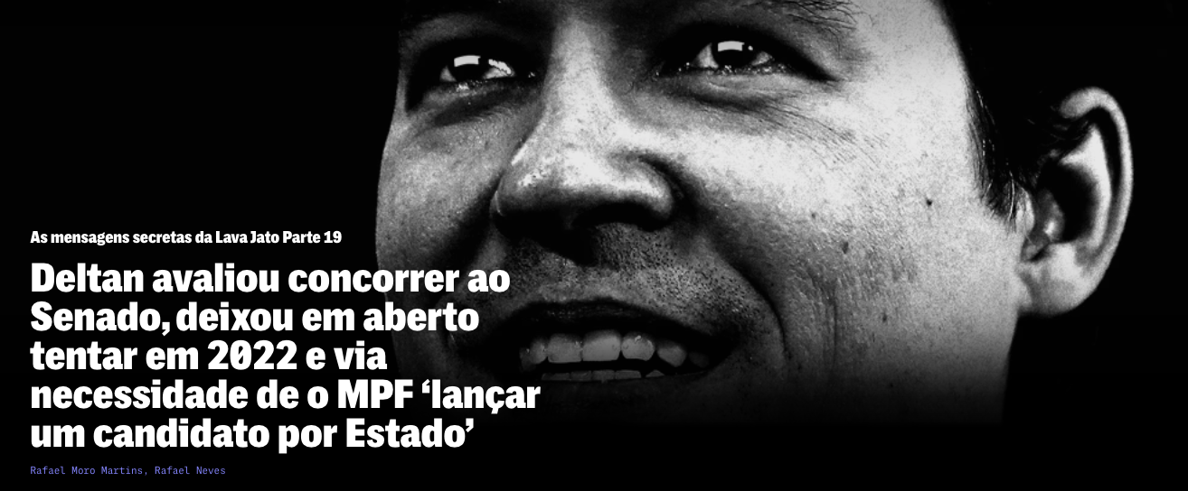 O procurador Deltan Dallagnol considerou durante mais de um ano se candidatar ao Senado nas eleições de 2018, revelam mensagens trocadas via Telegram e entregues ao Intercept por uma fonte anônima. Num chat consigo mesmo, que funcionava como espaço de reflexão do procurador, ele chegou a se considerar “provavelmente eleito”. Também avaliou que a mudança que desejava implantar no país dependeria de “o MPF lançar um candidato por Estado” — uma evidente atuação partidária do Ministério Público Federal, proibida pela Constituição.