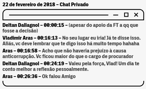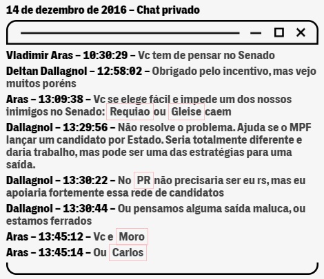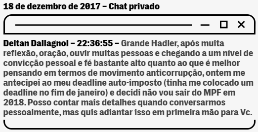 A PRIMEIRA MENÇÃO à aventura política de Deltan Dallagnol no Telegram surgiu em meados de dezembro de 2016, numa conversa entre ele e o procurador Vladimir Aras, que trabalhava em Brasília. Aras é próximo de Dallagnol, e foi apoiado por ele como sucessor de Raquel Dodge na PGR.