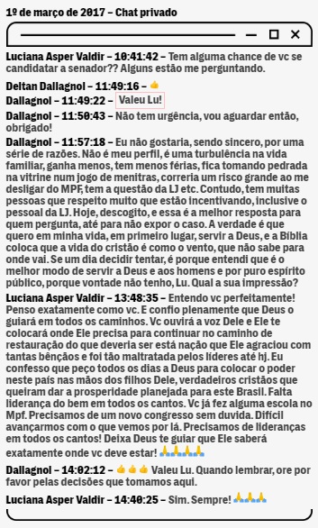 Não há, nas conversas do Telegram, indícios de que a medida da ANPR tenha sido tomada para favorecer uma hipotética candidatura de Deltan Dallagnol — para que pudesse disputar as eleições de 2018, ele teria de deixar o MPF até abril daquele ano.