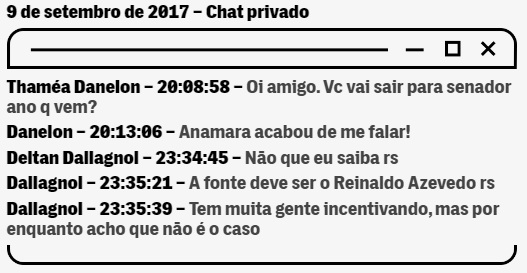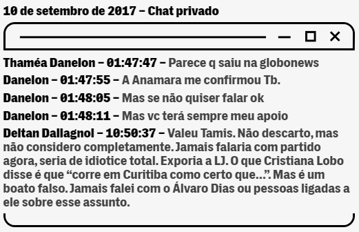 EM JULHO DAQUELE ANO, o boato chegou à procuradora Anamara Osório, que enviou via Telegram a seguinte mensagem a Dallagnol: “Delta!!!! Você senador para já!! Vamos falar disso?! O que vc precisa? Hehe”. O chefe da Lava Jato não respondeu.