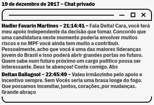 O papo continuou, com uma confidência de Dallagnol: a força-tarefa da Lava Jato apoiaria em peso sua candidatura.