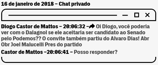 Meses antes, porém, em janeiro, Malucelli — também presidente do Podemos no Paraná e suplente do senador Alvaro Dias — abordou o procurador Diogo Castor de Mattos num clube de elite de Curitiba e lhe pediu seu número de celular. Sem conhecer os dilemas íntimos de Deltan Dallagnol ou as decisões que ele já comunicara aos amigos próximos, desejava lhe fazer uma proposta.