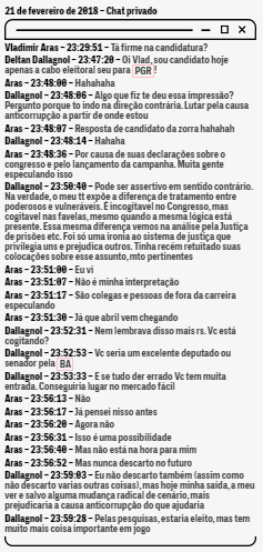 “Ele [Dallagnol] não falou em ser candidato, claramente, mas em ter procuradores [concorrendo] na eleição do ano que vinha. Até fui atrás [dos procuradores candidatos, em 2018], mas não apareceram. Foi após uma entrevista em vídeo, feita na [sede da] Procuradoria [Geral da República], em Brasília, em outubro de 2017. Após a entrevista, os cinegrafistas estavam desmontando os equipamentos e houve essa rápida conversa”, relembrou o jornalista Josias de Souza.