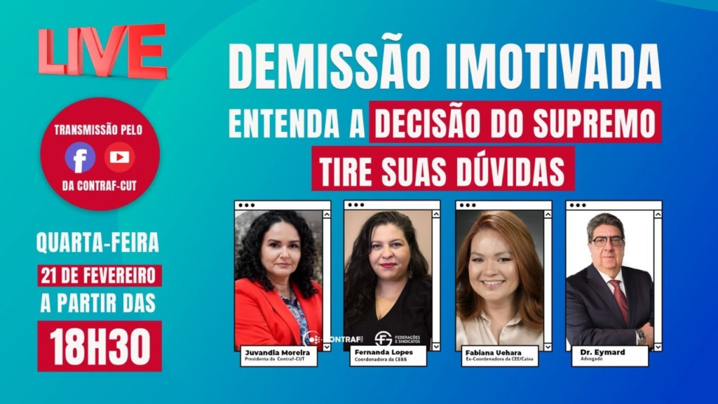 Bate-papo com transmissão ao vivo pelo Facebook e Canal no Youtube da Contraf-CUT vai explicar decisão do STF, que proíbe demissão imotivada de empregados concursados de empresas públicas e de economia mista, e tirar dúvidas que forem enviadas durante a transmissão ao vivo, ou antecipadamente para o WhatsApp, ou para o e-mail da Imprensa da Contraf-CUT.