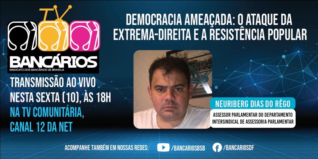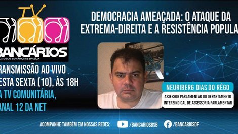 O TV Bancários vai ao ar nesta sexta-feira (10) com o tema "Democracia ameaçada: o ataque da extrema-direita e a resistência popular". O convidado do programa é Neuriberg Dias do Rêgo, assessor parlamentar do Departamento Intersindical de Assessoria Parlamentar (Diap).
