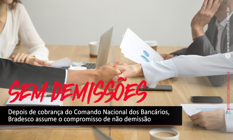Logo depois de sua participação na live realizada no perfil do Instagram da Confederação Nacional dos Trabalhadores do Ramo Financeiro (Contraf-CUT), na noite desta quarta-feira (8), a presidenta da Confederação, Juvandia Moreira, recebeu uma ligação da direção do Bradesco para informar que o banco não irá demitir durante a pandemia do coronavírus (Covid-19).