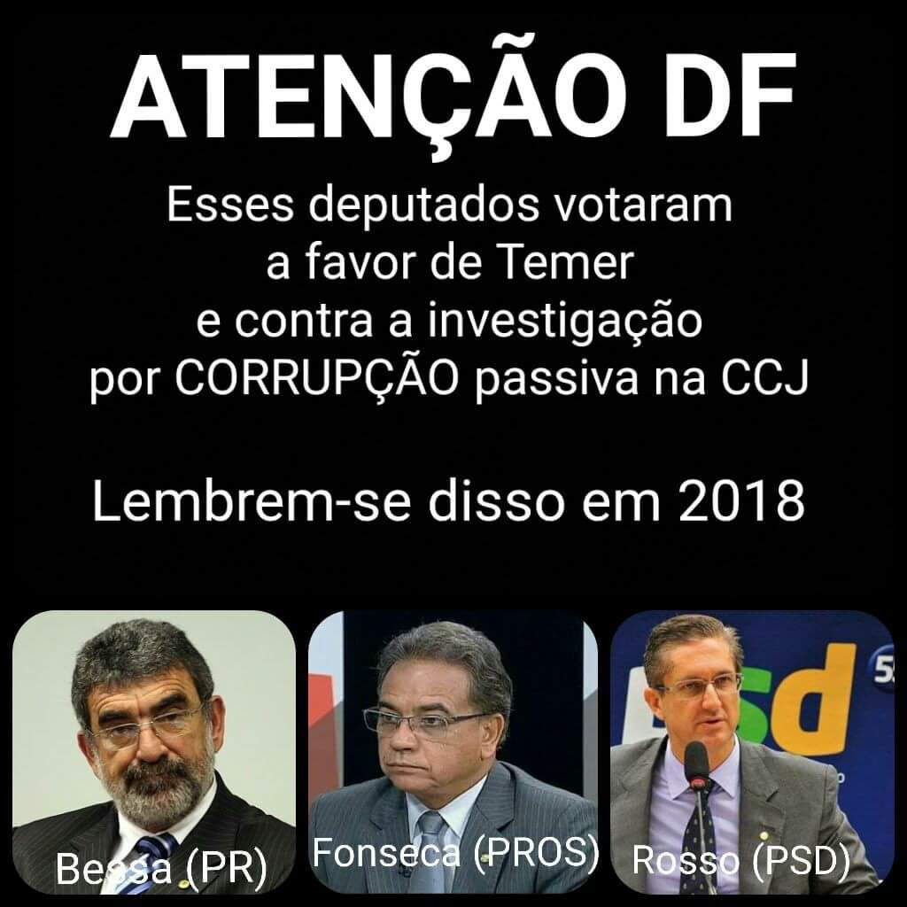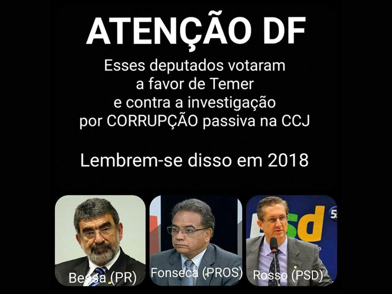 Laerte Bessa (PS), Ronaldo Fonseca (PROS) e Rogério Rosso (PSD). Guardem bem os nomes desses deputados federais de Brasília que votaram a favor de Temer e contra a investigação por corrupção passiva do presidente ilegítimo na Comissão de Constituição e Justiça (CCJ) da Câmara, nesta quinta-feira (13).