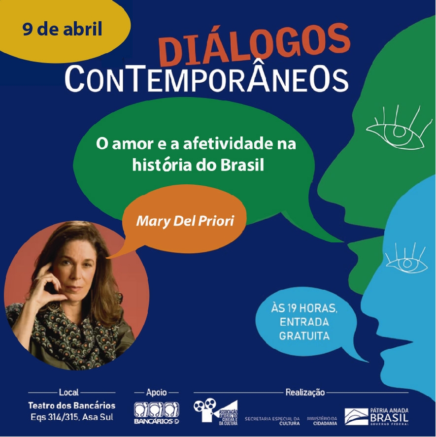A historiadora Mary Del Priori é a convidada de terça-feira (09) do projeto ‘Diálogos Contemporâneos’, às 19h, no Teatro dos Bancários. Ela vai falar sobre o tema ‘O amor e a afetividade na história do Brasil’, uma abordagem das relações afetivas e sua construção histórica na sociedade brasileira. O Lugar do amor, nas suas diversas manifestações, e o espaço da empatia e da solidariedade no Brasil contemporâneo.