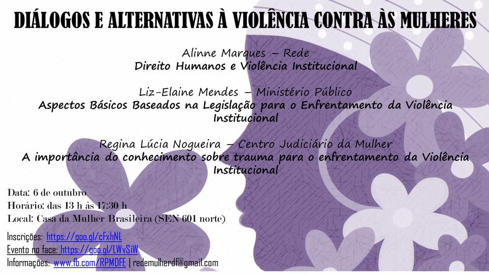 São três palestras - Direitos humanos e violência institucional, Aspectos básicos baseados na legislação para o enfrentamento da violência institucional e A importância do conhecimento sobre trauma para o enfrentamento da violência institucional, a serem proferidas por Alinne Marques (Rede), Liz-Elaine Mendes (Ministério Público) e Regina Lúcia Nogueira (Centro Judiciário da Mulher), respectivamente.