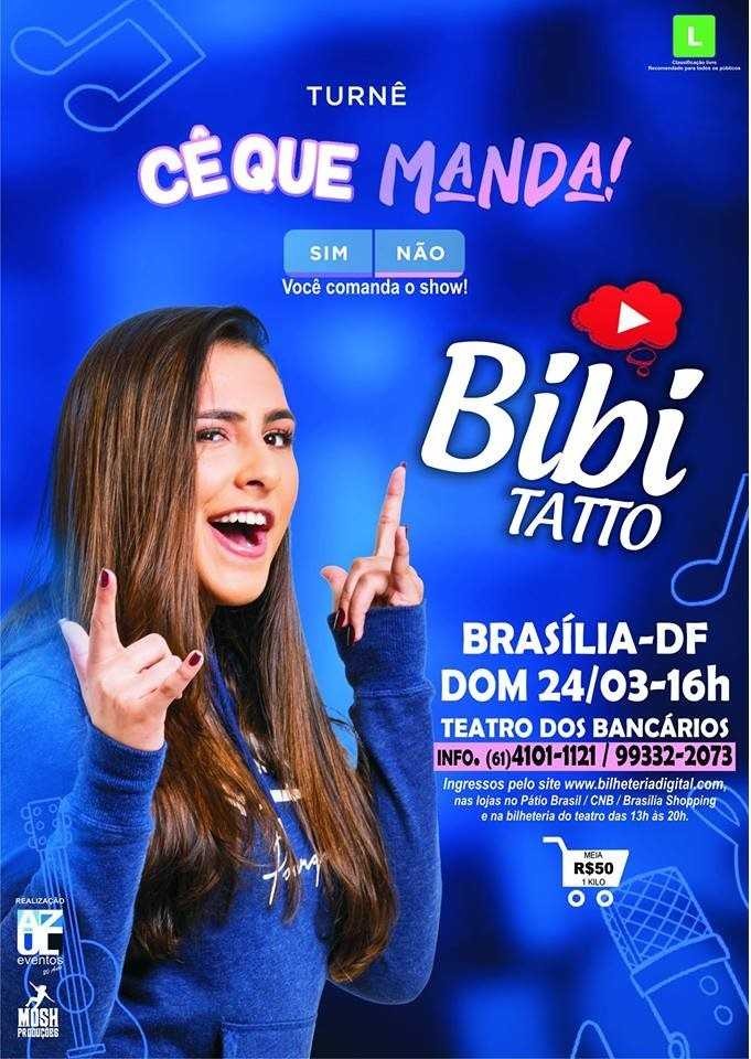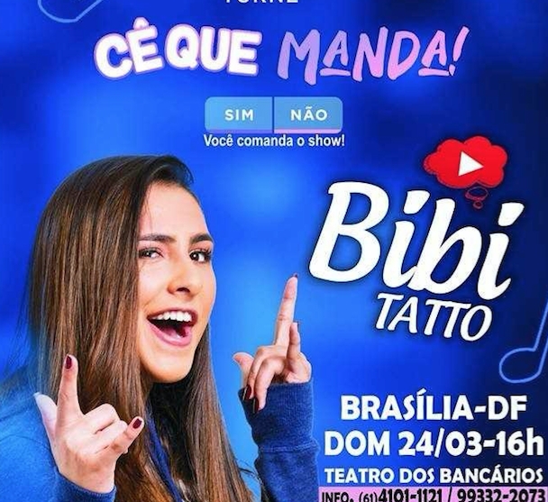 Sucesso do entretenimento entre as crianças e adolescentes, a paulistana Bibi Tatto apresenta neste domingo (24), no Teatro dos Bancários, o espetáculo ‘Cê que manda’. A peça possibilita ao público escolher qual caminho o show vai tomar, introduzindo inúmeras brincadeiras e interagindo com a plateia.