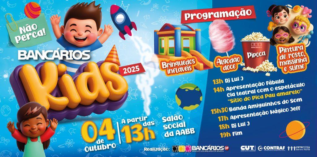 O Bancários Kids está chegando para garantir muita alegria, música, brincadeiras e aquele clima de festa que a criançada adora para comemorar o seu dia. No dia 4 de outubro, no salão social da AABB, a partir das 13h, filhos e filhas de sindicalizados terão à disposição uma programação especial com jogos, atividades recreativas, espaços de diversão com monitores, oficinas criativas, brinquedos infláveis, apresentações culturais e muito mais.