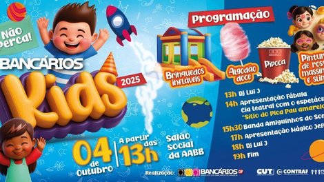 O Bancários Kids está chegando para garantir muita alegria, música, brincadeiras e aquele clima de festa que a criançada adora para comemorar o seu dia. No dia 4 de outubro, no salão social da AABB, a partir das 13h, filhos e filhas de sindicalizados terão à disposição uma programação especial com jogos, atividades recreativas, espaços de diversão com monitores, oficinas criativas, brinquedos infláveis, apresentações culturais e muito mais.