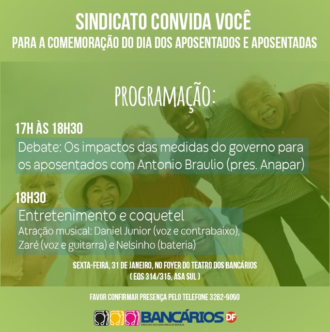 O Sindicato celebra e homenageia os trabalhadores aposentados com grande evento nesta sexta-feira (31). O encontro, que terá início às 17h, comemora o Dia do Aposentado e da Aposentada com debate e entretenimento. A festa será realizada no foyer do Teatro dos Bancários (EQS 314/15).