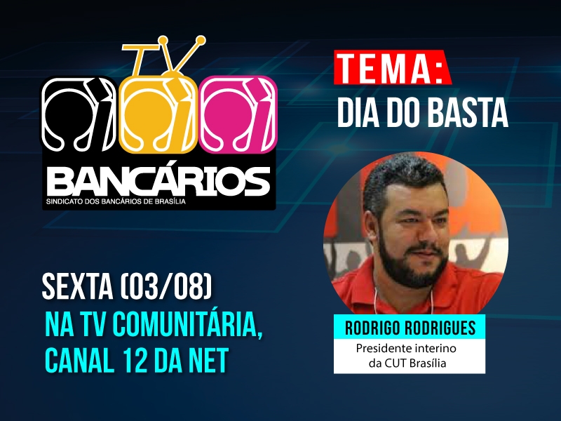 Trabalhadores e trabalhadoras de Brasília se organizam dizer “basta” às políticas adotadas pelo governo ilegítimo de Michel Temer e às medidas do governador Rodrigo Rollemberg. Para falar sobre o Dia do Basta, agendado para 10 de agosto, o programa TV Bancários recebe o presidente interino da CUT Brasília, Rodrigo Rodrigues. A edição será transmitida ao vivo, às 14h30, pela TV Comunitária (Canal 12 da net) e pela página do Sindicato no Facebook.