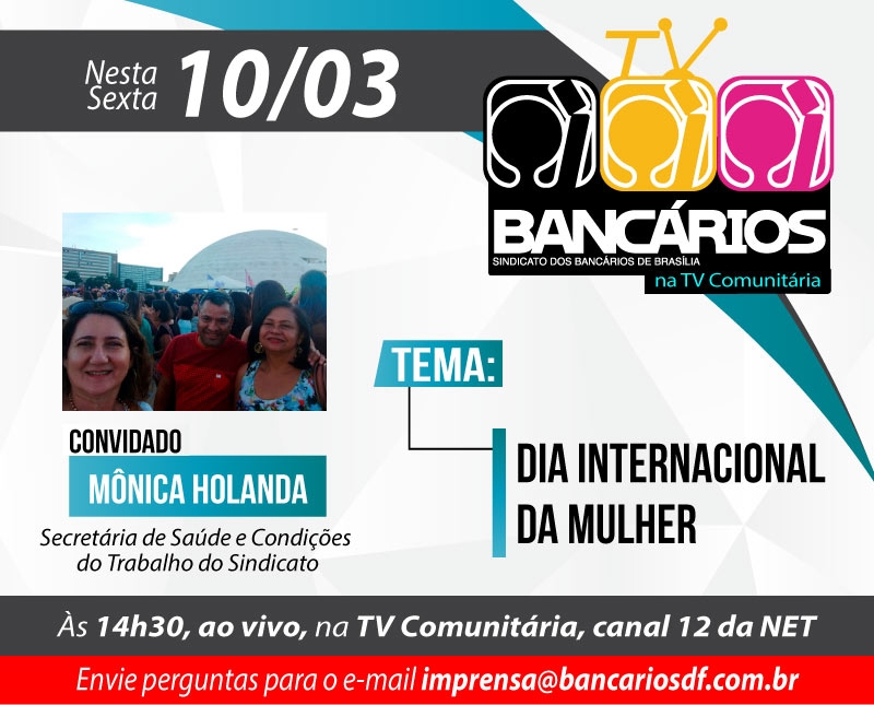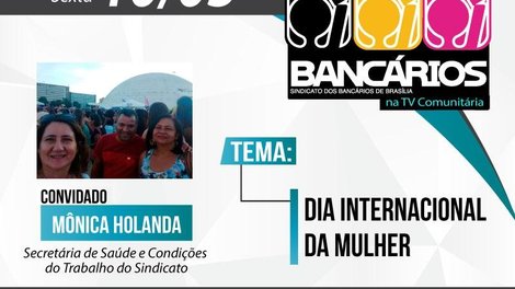 O TV Bancários na TV comunitária, com exibição inédita nesta sexta (10) a partir das 14h30, vai tratar do Dia Internacional da Mulher e os atos em prol desta data que aconteceram DF afora. Como convidada o programa recebe Mônica Holanda, bancária do Banco do Brasil e secretária de Saúde e Condições do Trabalho do Sindicato.