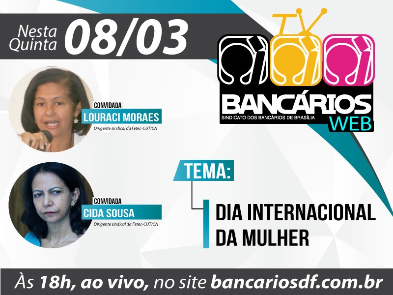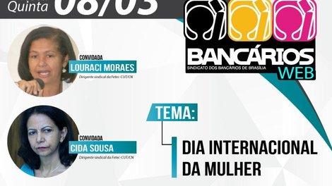 Nesta quinta-feira (8), o TV Bancários Web vai falar sobre o Dia Internacional da Mulher. Como convidadas, o programa recebe as dirigentes sindicais da Fetec-CUT/CN Cida Sousa e Louraci Morais.