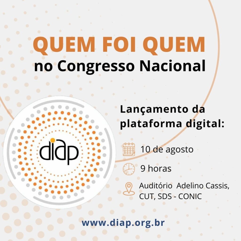 O Departamento Intersindical de Assessoria Parlamentar (Diap) lança nesta quarta-feira (10), às 9h, a plataforma digital ‘Quem foi Quem’ no Congresso Nacional, um importante instrumento de estudo legislativo para a classe trabalhadora e sociedade brasileira nas eleições de 2022. O evento será realizado no auditório Adélio Cassis, da CUT-DF, no Setor de Diversões Sul (Conic).