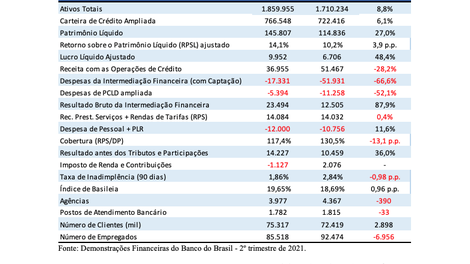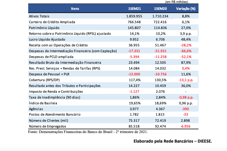 Mesmo com o resultado positivo, o BB, que ao final junho deste ano contava com 85.518 funcionários, fechou 6.956 postos de trabalho em 12 meses e 2.358 do 1º para o 2º trimestre, resultado do desligamento de funcionários, no escopo do Programa de Adequação de Quadros (PAQ) e do Programa de Desligamento Extraordinário (PDE). Foram fechadas 390 agências e 33 postos de atendimento bancário, em comparação junho de 2020, e o número de clientes aumentou em 2,9 milhões.