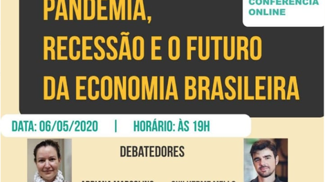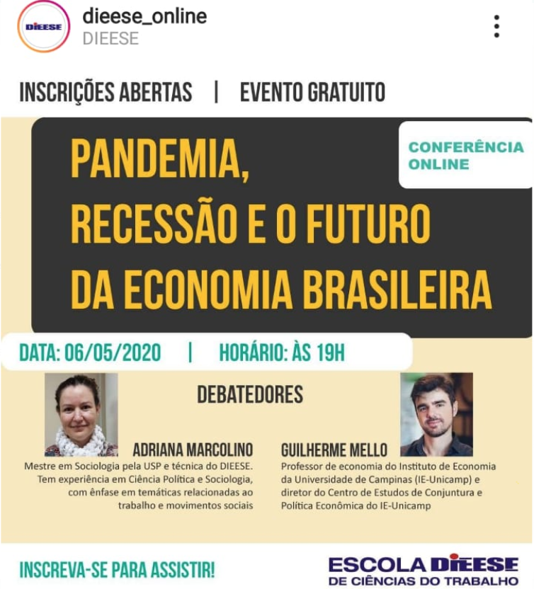 Pandemia, recessão e o futuro da economia brasileira é o tema da conferência online que a Escola Dieese de Ciências do Trabalho apresenta nesta quarta-feira (6), às 19h.