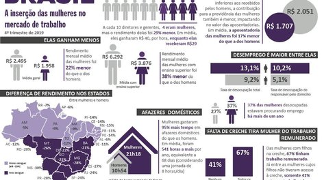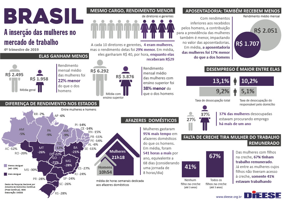 Segundo o órgão, no ano passado, as mulheres brasileiras dedicaram 21 horas semanais ao trabalho doméstico (ao passo que eles dedicaram somente 10,5 horas), ganharam em média salário 22% inferior ao dos homens e tiveram taxa de desemprego 4 pontos superior ao sexo masculino.
