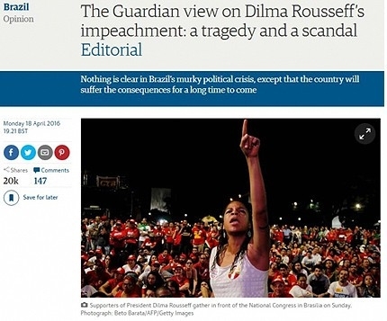 O jornal inglês The Guardian fez um editorial duro e assegura que o impedimento de Dilma é uma tragédia e um escândalo. Leia aqui o artigo: http://goo.gl/cUyHTZ