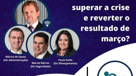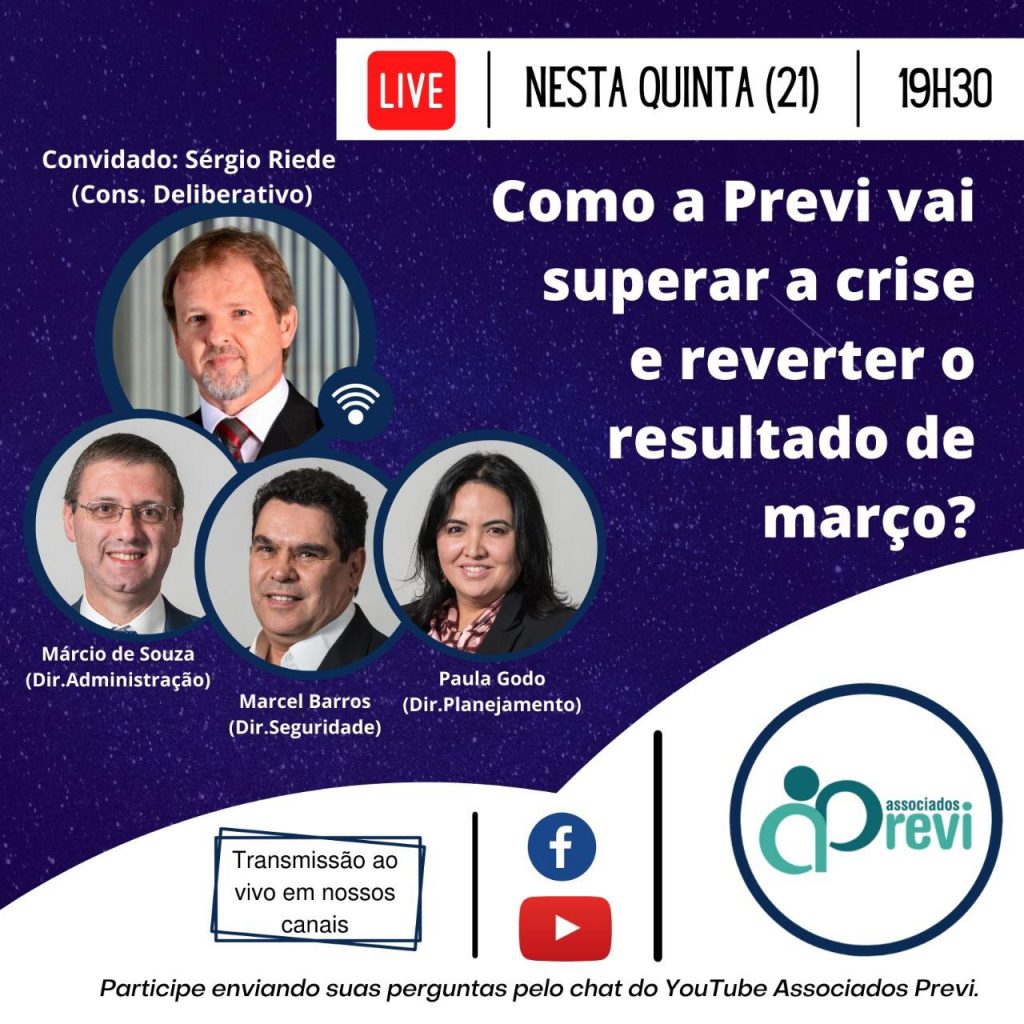 Como a Previ vai superar a crise e reverter o resultado de março é o tema de live desta quinta-feira (21), às 19h30, que tem como convidado Sérgio Riede, do Conselho Deliberativo, e a participação dos diretores Marcel Barros (Seguridade), Mário de Souza (Administração) e Paula Goto (Planejamento).