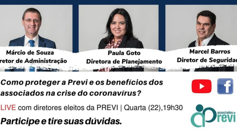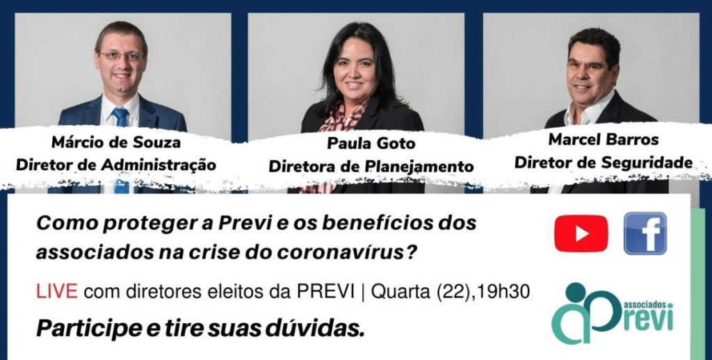 Como proteger a Previ na crise do coronavírus? Para responder a essa pergunta, o diretor de Administração, Márcio Souza, a diretora de Planejamento, Paula Goto, e o diretor de Seguridade, Marcel Barros, participam nesta quarta-feira (22) de uma live promovida pelos Associados Previ no Youtube e no Facebook, com início às 19h30.