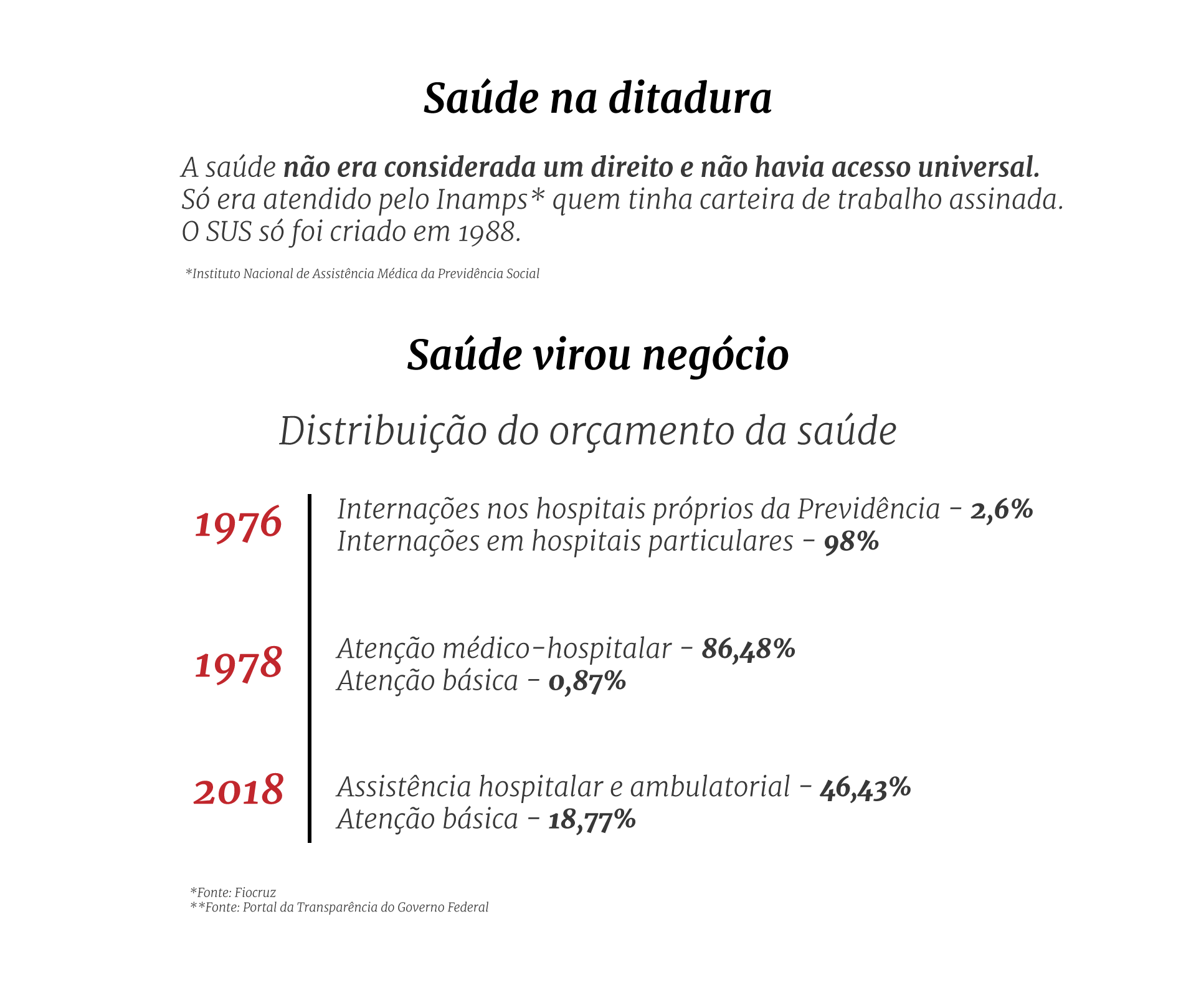 Nesse sentido, o Brasil de Fato fez um levantamento dos dados em relação ao acesso à saúde no período da ditadura comparando com os atuais, para desconstruir uma ideia no senso comum de que havia um bom atendimento naquele período. Os dados de orçamento da União mostram ainda que o investimento em saúde girou em torno de 1% do PIB durante os anos de chumbo, mesmo durante o chamado “milagre econômico”, e era em grande parte direcionado à medicina curativa, praticamente ignorando a atenção básica. Na mesma época, ao Ministério dos Transportes e às Forças Armadas, por exemplo, eram reservados 12% e 18% do orçamento, respectivamente.