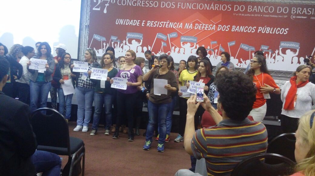 Em repúdio à cultura machista e do estupro que viola o espaço e a intimidade da mulher, as trabalhadoras bancárias do Banco do Brasil se manifestaram contra o assédio sexual neste domingo (19), último dia do 27º Congresso Nacional dos Funcionários do BB, realizado em São Paulo. Com uma moção, apresentada pela diretora do Sindicato Teresa Cristina e aprovada por unanimidade pela plenária final, elas reforçaram a necessidade de garantir que as mulheres sejam efetivamente respeitadas e incluídas em todos os espaços da sociedade.