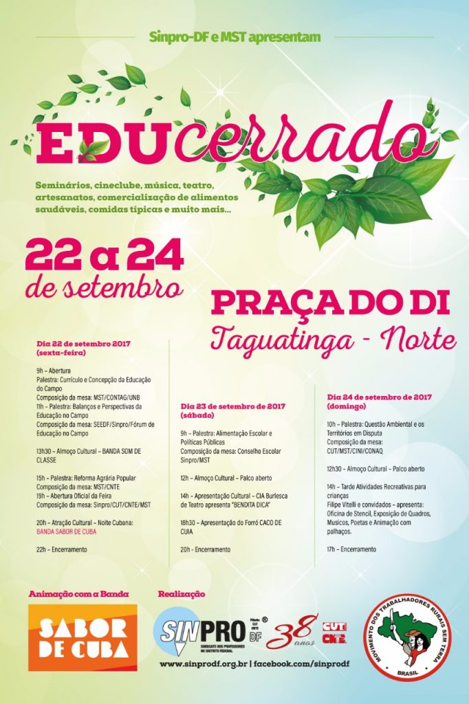 O Sindicato dos Professores do DF (Sinpro) em parceria com o Movimento Sem Terra (MST) realizarão o EduCerrado. A ideia do encontro é discutir a educação do campo, debater sobre a importância da Reforma Agrária para os trabalhadores rurais e apresentar para a população a feira e a culinária da terra do MST. Além disso, a ação contará com um amplo ciclo de seminários, cineclube, música, teatro, comidas típicas e muito mais.